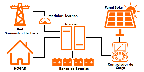 Los inversores están conectados a la red eléctrica de modo que aportan energía a los consumos conectados a la red del hogar. Además, permite la conexión de equipos desconectados de la red (OFF GRID) que continuarán funcionando durante los cortes de luz. Admite la conexión de baterías.